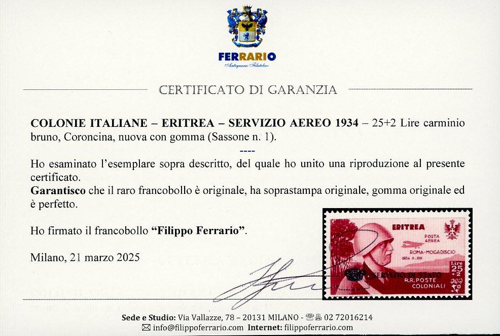 Lot 1901 - SERVIZIO AEREO 1934 - 25 + 2 lire Coroncina (1), nuovo, ...