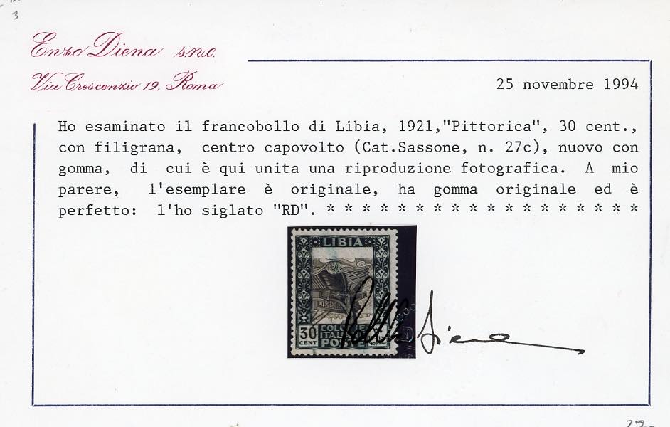 1921 - 30 cent. Pittorica, filigrana corona, centro capovolto e fortemente spostato in basso (27ca), gomma originale, perfetto. Molto raro! A.Diena, cert. Diena.