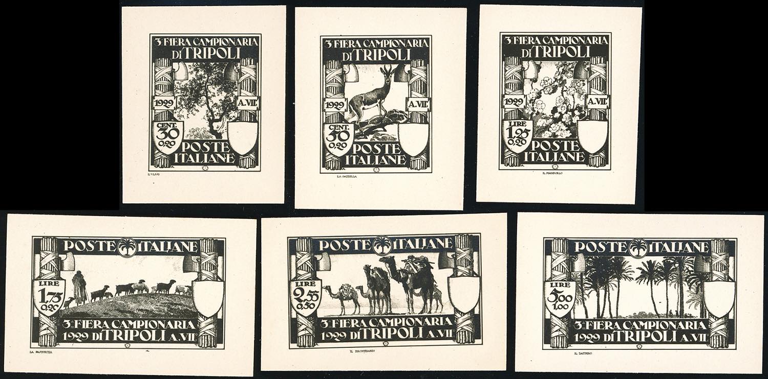 1929 - III Fiera di Tripoli (81/86), saggi fotografici senza indicazione del valore in valuta locale, senza gomma come sempre, perfetti. Belli e rari. Cert. Ferrario.