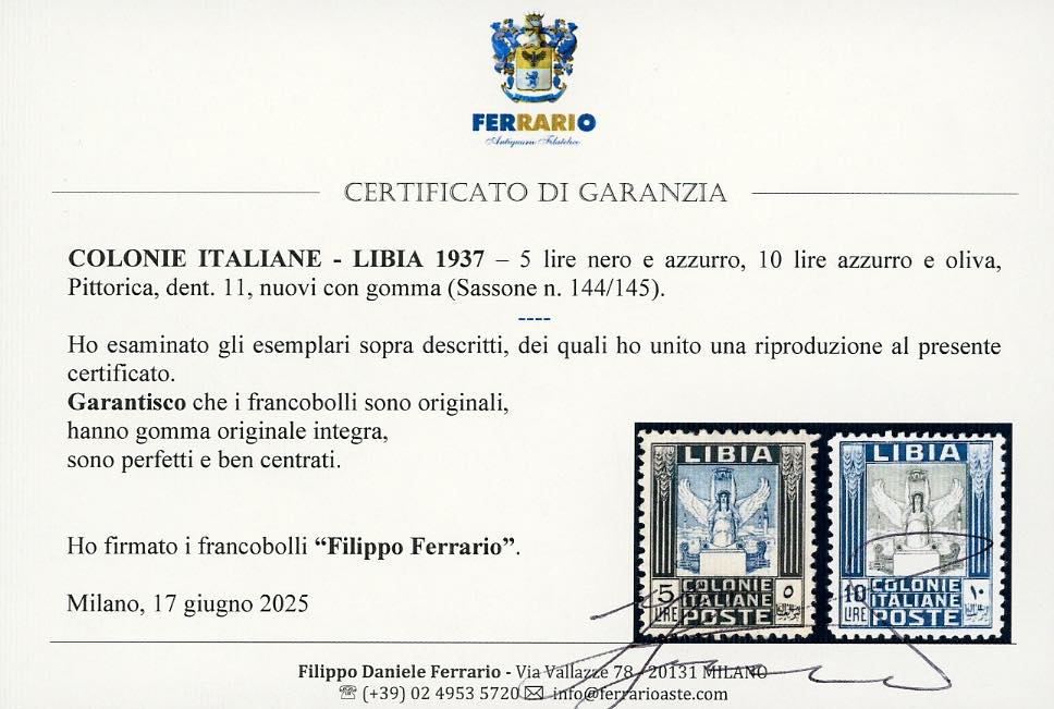 1937 - 5 lire e 10 lire Pittorica, dent. 11 (144/145), ben centrati, nuovi, gomma originale integra, perfetti. Il 5 lire cert. A.Diena, il ... Read more