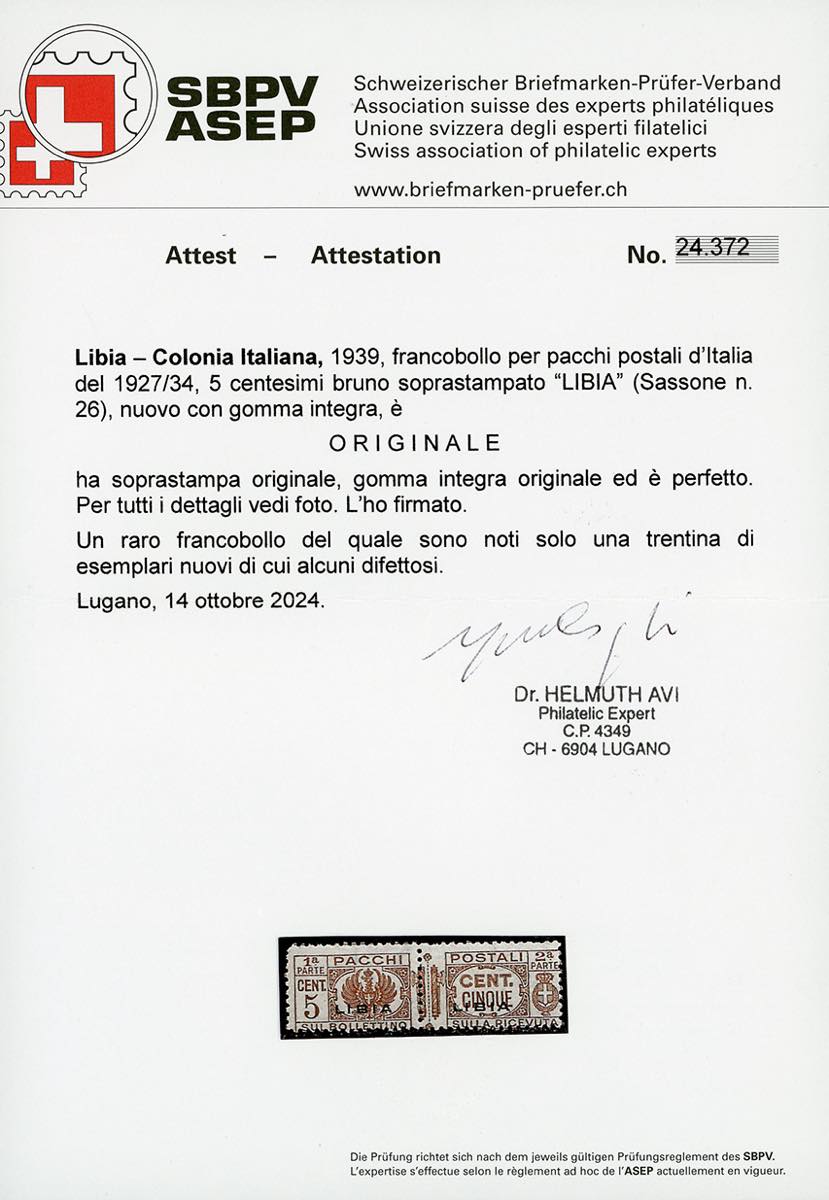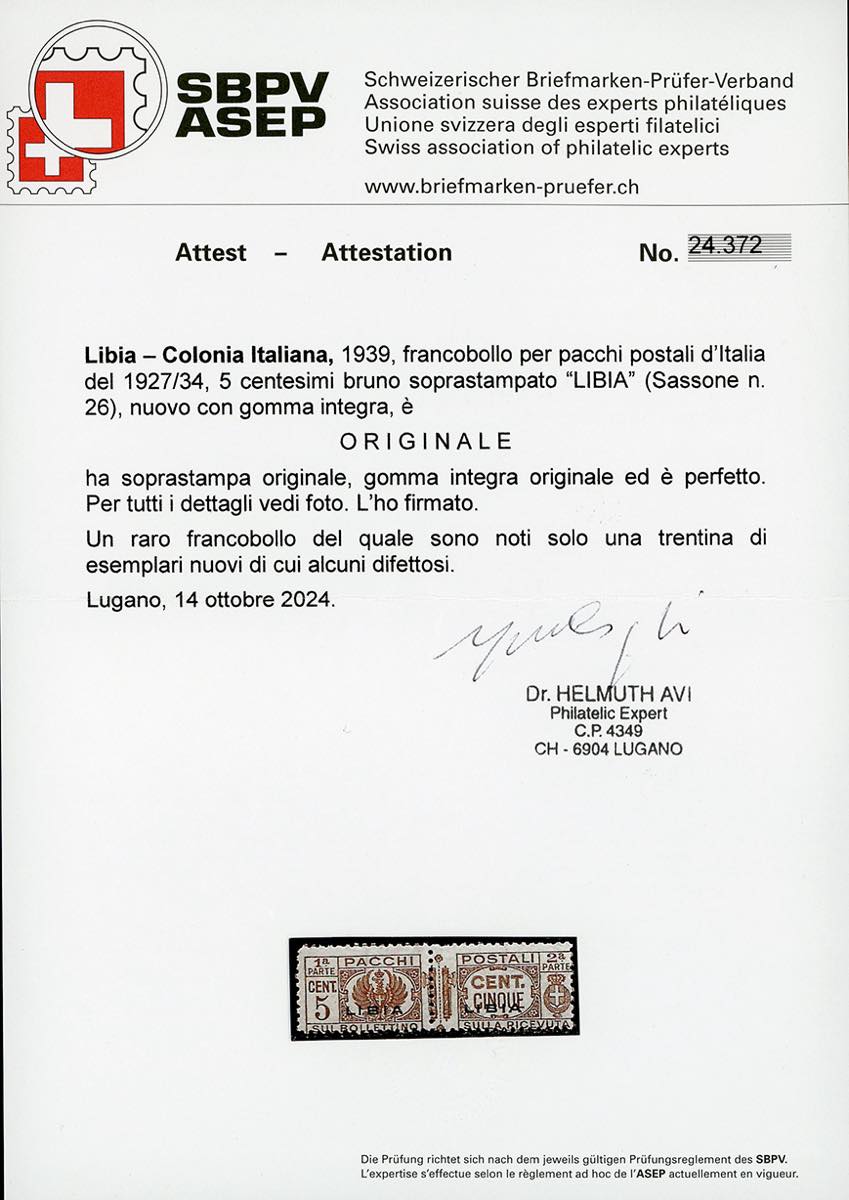 PACCHI POSTALI 1939 - 5 cent. bruno fasci al centro, soprastampato (26), nuovo, gomma originale integra, perfetto. Molto raro, sono noti solo una trentina di esemplari nuovi, di cui alcuni difettosi. Uno dei francobolli più rari delle Colonie Italiane. Cert. Avi.