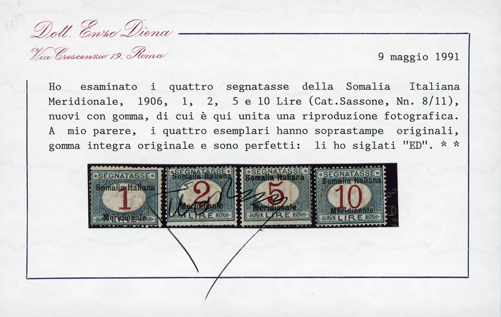 SEGNATASSE 1906 - Soprastampati "Somalia Italiana Meridionale", serie completa (1/11), nuovi, gomma originale integra, perfetti. Molto freschi. Alti valori cert. Enzo Diena.