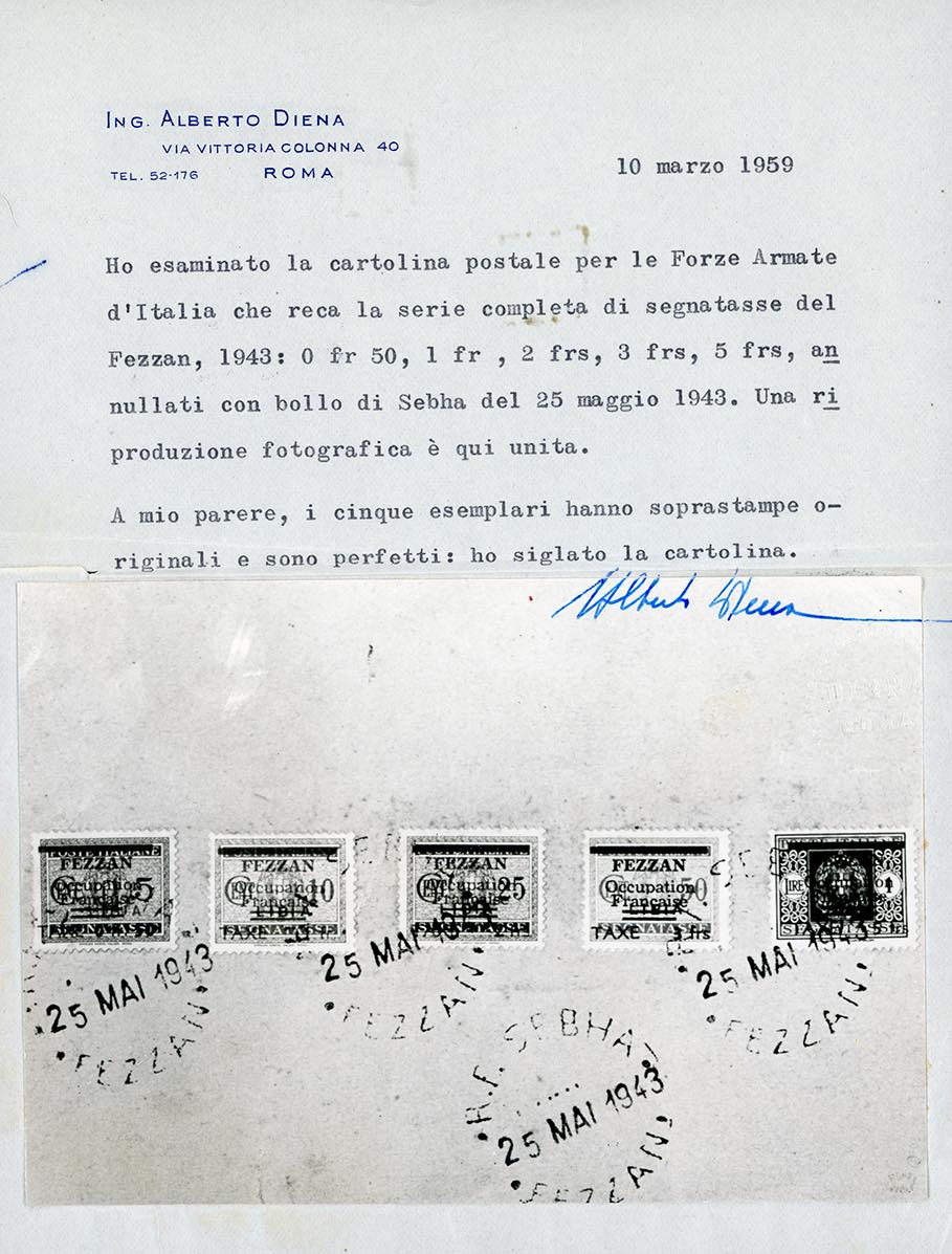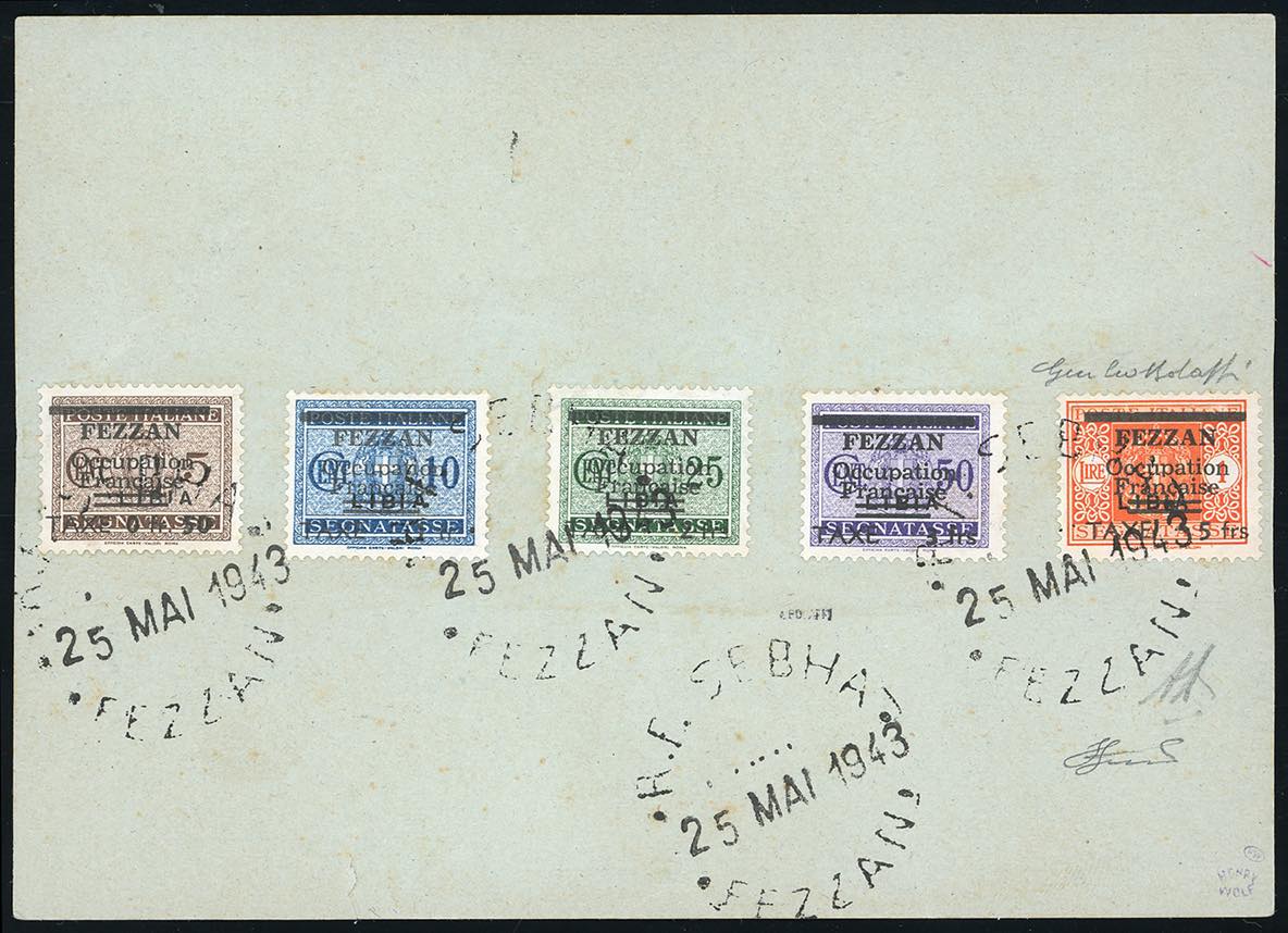 OCCUPAZIONE FRANCESE FEZZAN SEGNATASSE 1943 - Soprastampati, serie completa (1/5), perfetti, al verso di cartolina per le forze armate, usata a Sebha 25/5/1943. SI TRATTA DELL'UNICO CASO SU CORRISPONDENZA DEL RARISSIMO 5 FRANCHI. Giulio Bolaffi per esteso, cert. A.Diena e Ferrario.