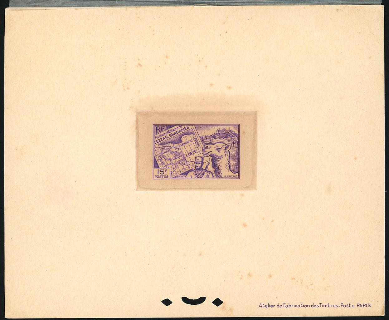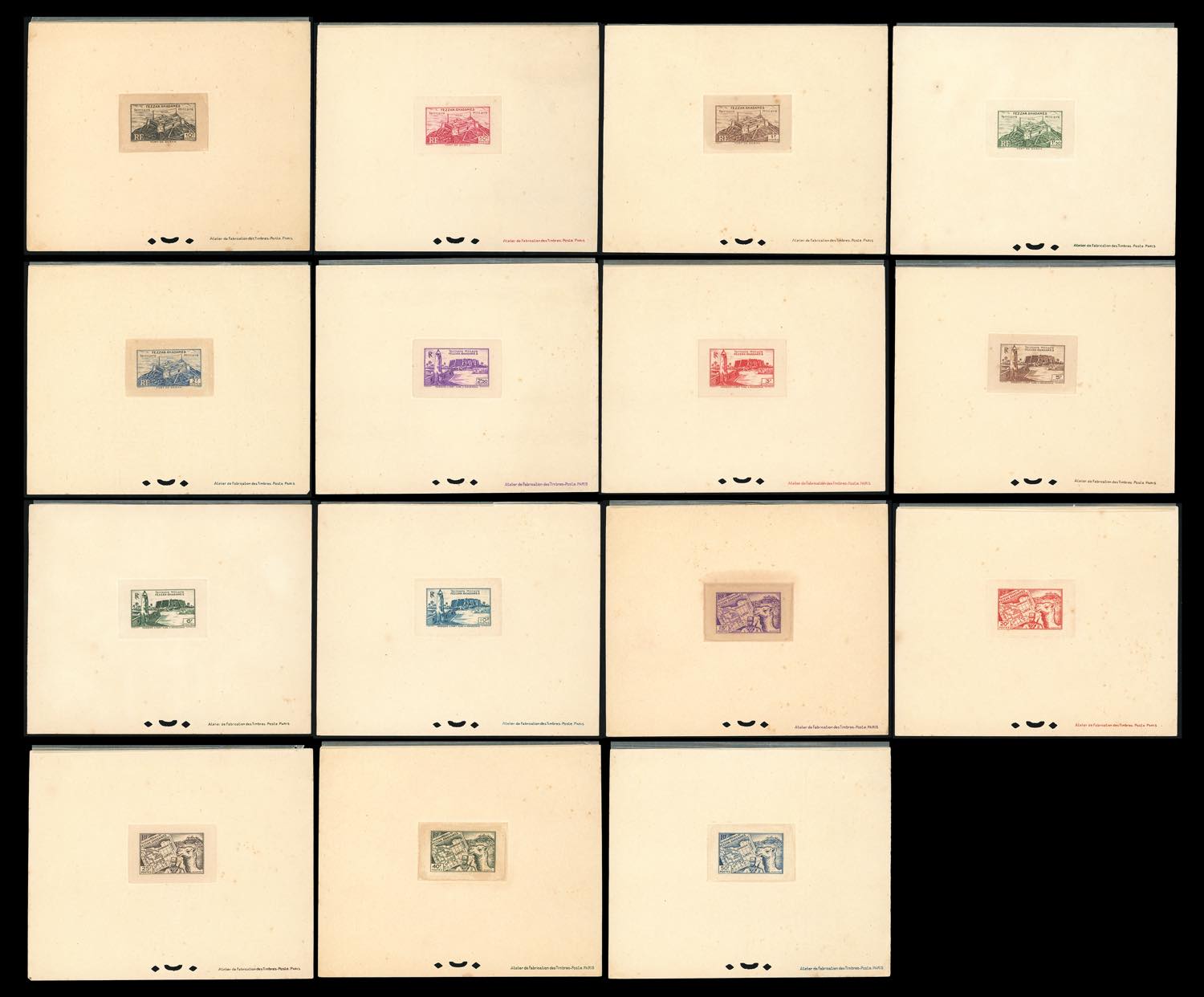 FEZZAN E GHADAMES 1946 - Prima emissione, prove di lusso (con velina originale sul fronte) dei valori della serie completa, nei colori adottati (1/15), perfette. Raro insieme.