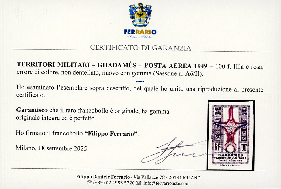 Lot 2108 - GHADAMES POSTA AEREA 1949 - 100 f. lilla e rosa, errore di ...