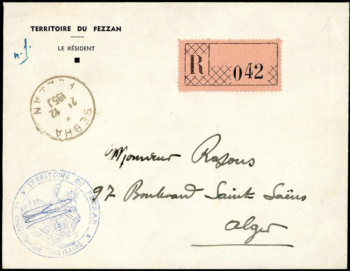 FEZZAN 1950 - Lettera raccomandata in franchigia da Sebha 21/12/1950 ad Algeri, sul fronte il bollo figurato del Governatore Militare. Rara.
