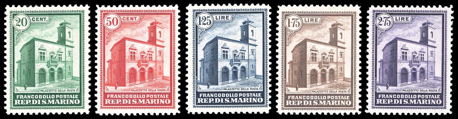 1932 - Palazzetto della Posta, serie completa (159/163), nuovi, gomma originale integra, perfetti. G.Bolaffi ed A.Diena per l'1,25 lire, cert. Ferrario per la serie.