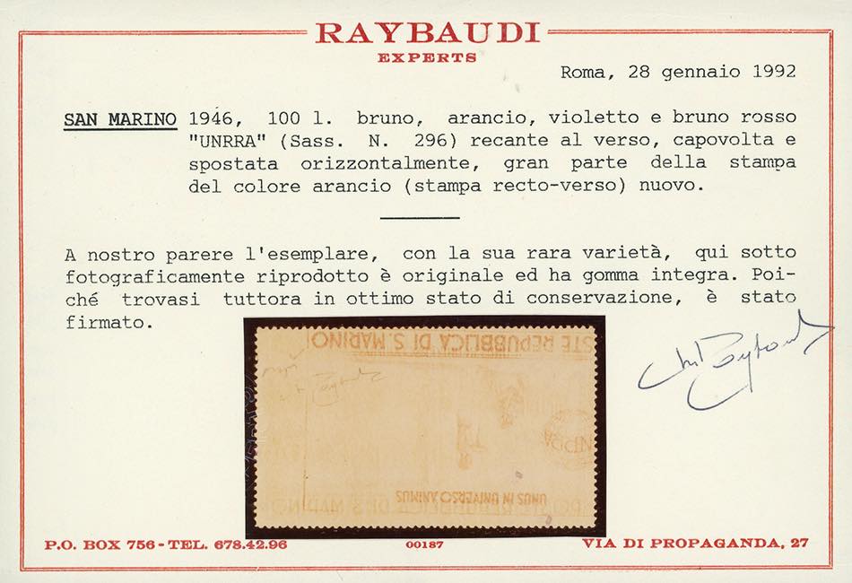 1946 - 100 lire UNRRA, stampa recto-verso del bruno arancio, capovolta al verso (296e), gomma integra, perfetto. Rarissimo! Cert. Raybaudi e Chiavarello.