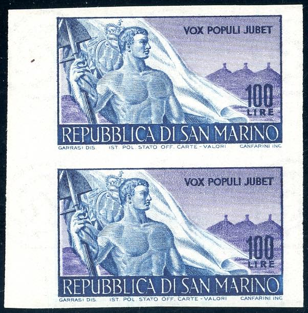 1948 - 100 lire Lavoro, coppia orizzontale non dentellata (340a), bordo di foglio, gomma originale integra, perfetta. Rara. Cert. Ferrario.