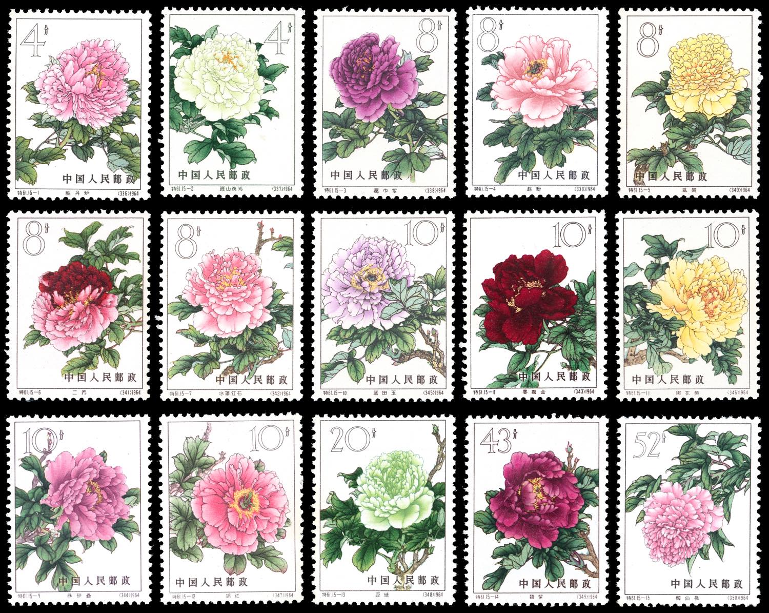 1964 - Peonies, complete set (Mi.795/809), full originale gum, MNH, perfect conditions, but in part with gum yellowed.