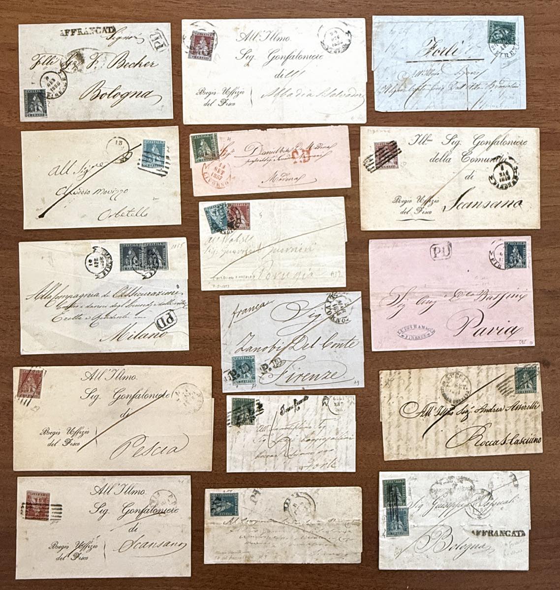 TOSCANA 1852/1857 - Quindici lettere affrancate del periodo, con qualche interessante presenza. Alto valore di catalogo, un cert. Raybaudi. Ottimo per dettaglio.
