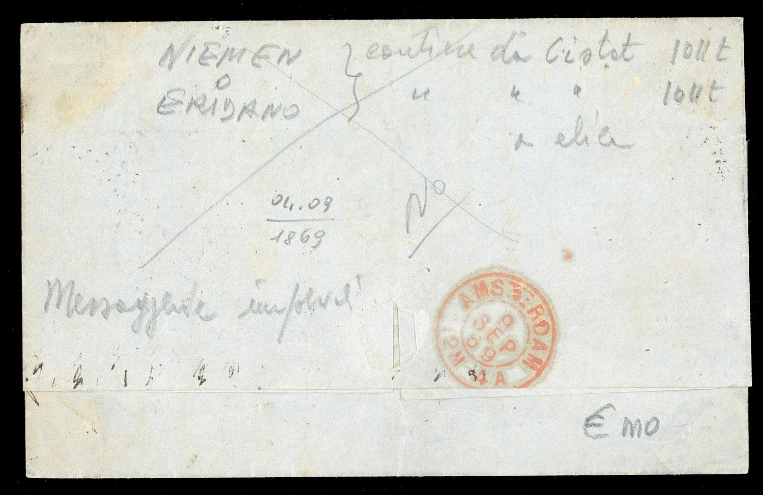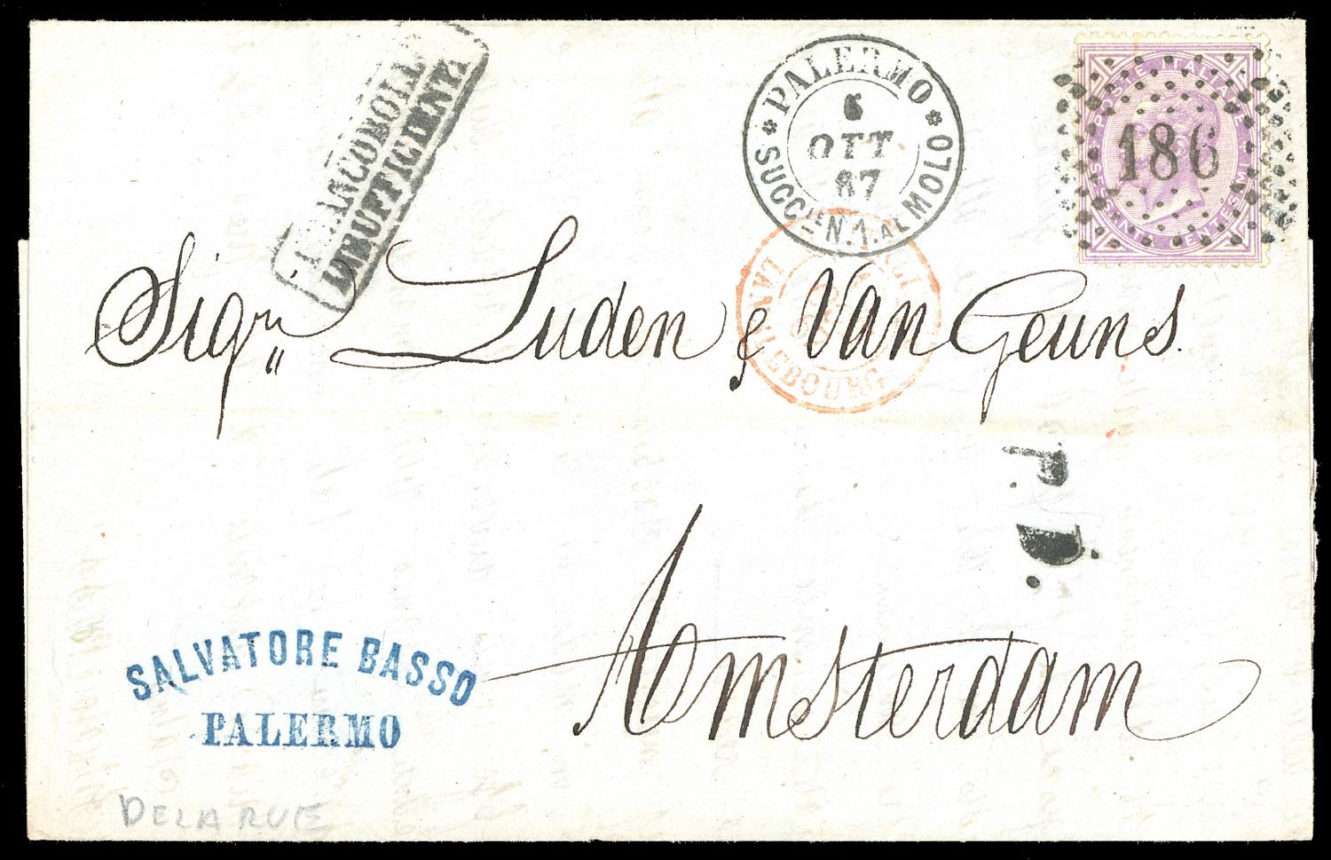 REGNO D'ITALIA 1864/66 - Bell'insieme di quattro lettere del periodo dall'Italia ad Amsterdam, in Olanda, tutte con differenti affrancature e bollo in cartella "francobollo insufficiente", una sola tassata in arrivo. Insieme interessante, per specialista. Ex coll. Imperato.