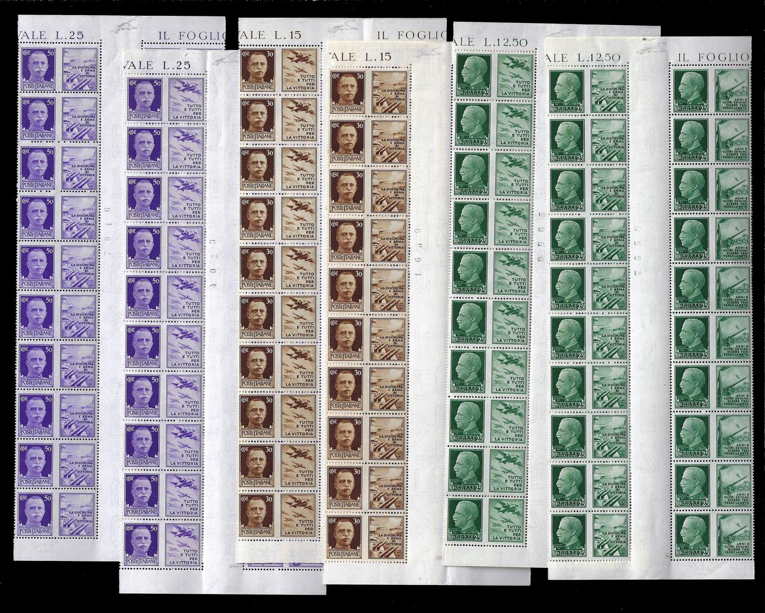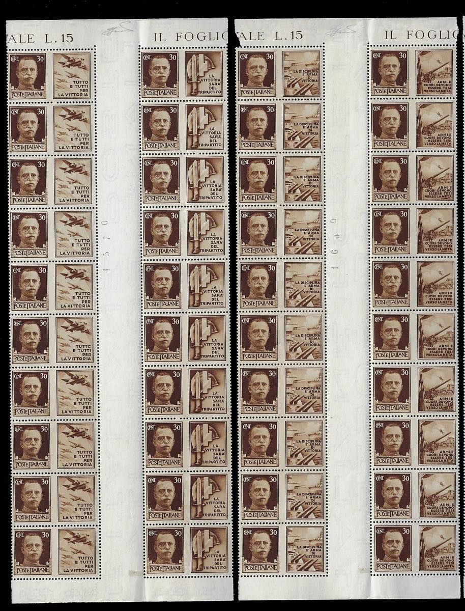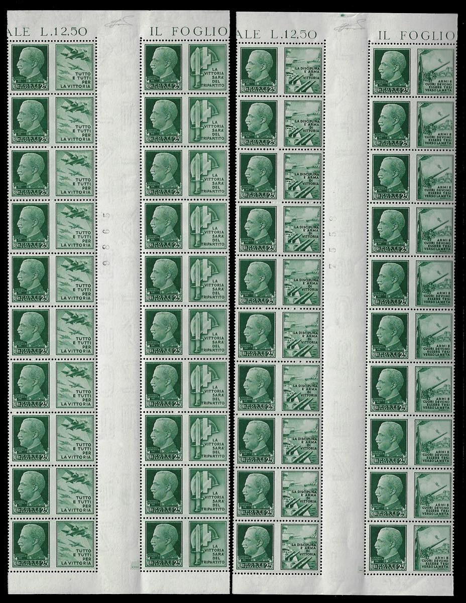 REGNO D'ITALIA PROPAGANDA DI GUERRA 1942 - Dieci serie complete (1/12), in blocchi di 20 con interspazio di gruppo al centro, non piegato. Non comuni, ottima qualità.