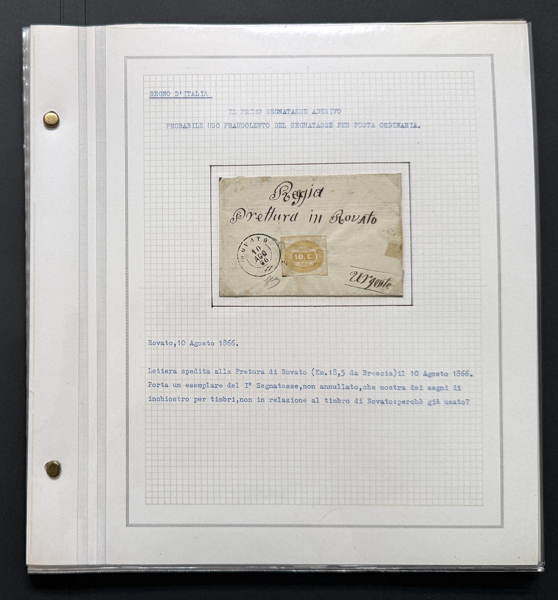 REGNO D'ITALIA SEGNATASSE 1863/1870 - Avviata collezione sui segnatasse n. 1 e n. 2 del Regno d'Italia, comprendente esemplari su lettera, annullati e non, e su frammento, montata in fogli d'esposizione. Alto valore di catalogo, ottimo per dettaglio, da esaminare.