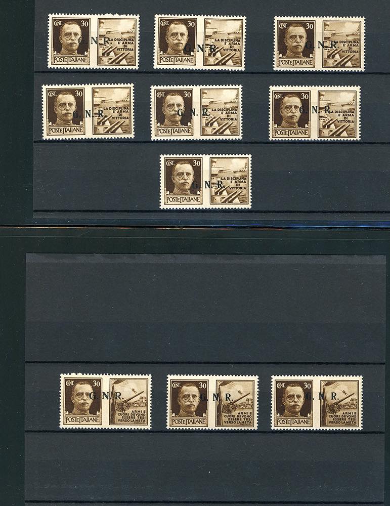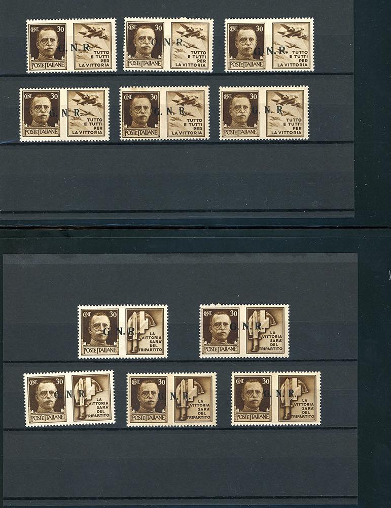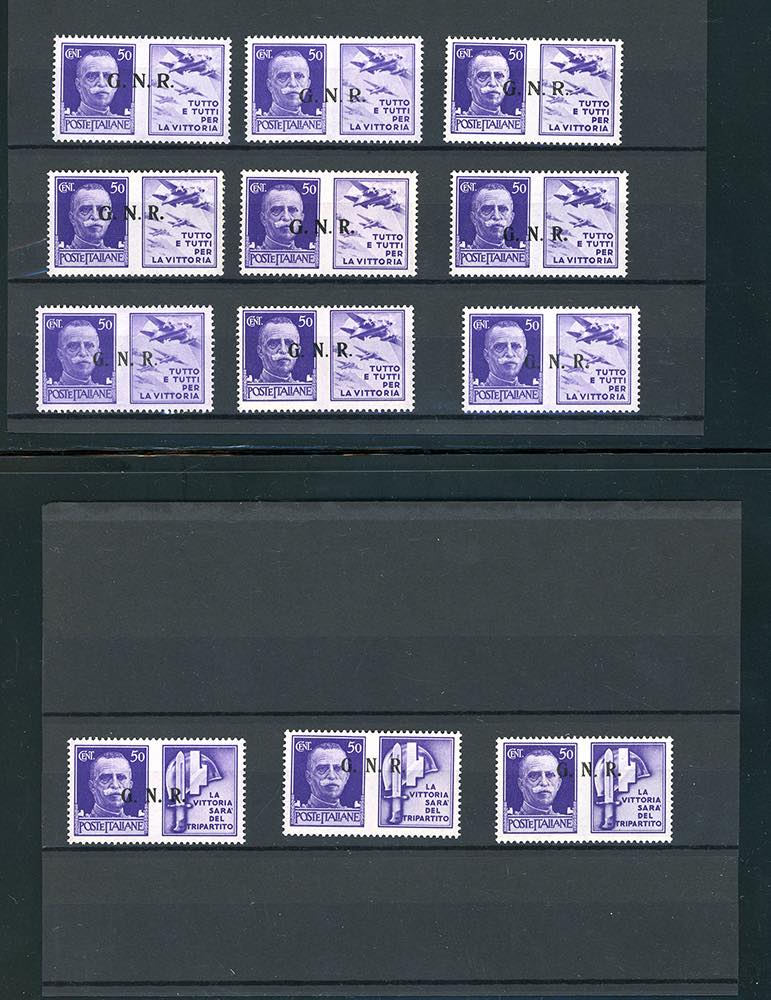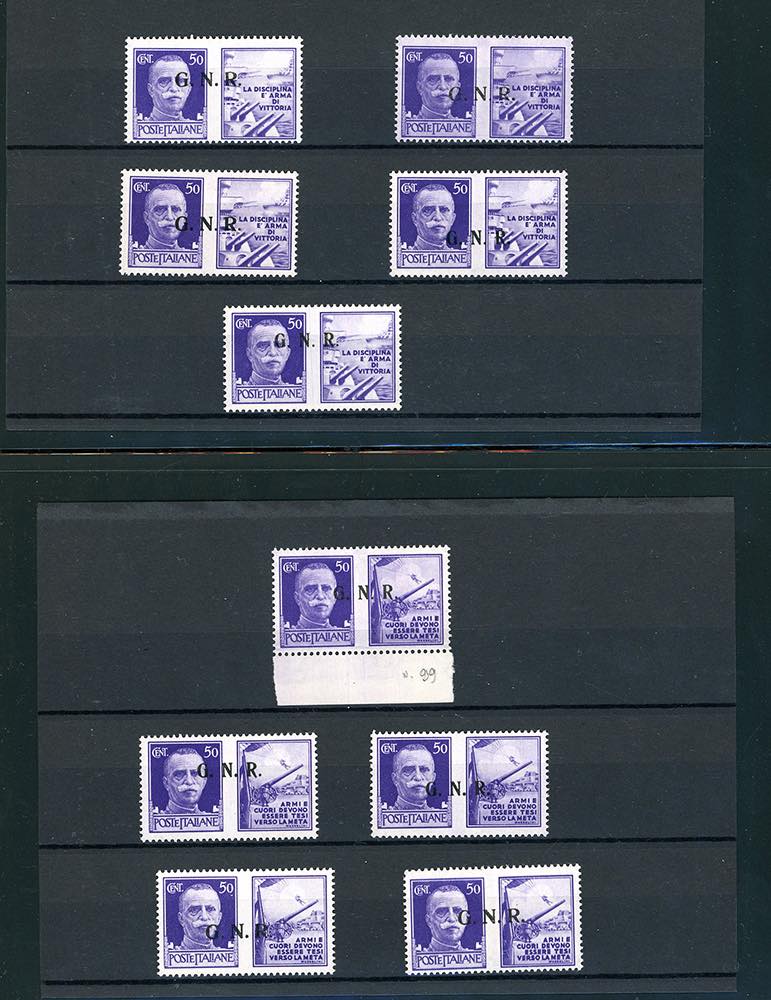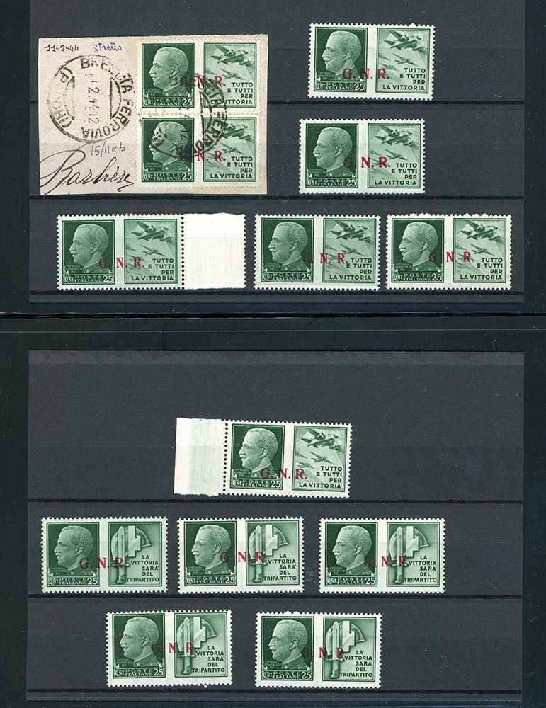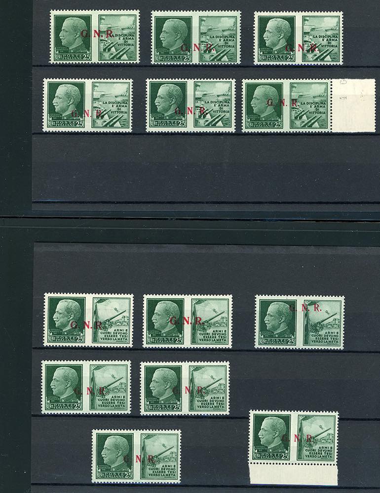 REPUBBLICA SOCIALE ITALIANA PROPAGANDA DI GUERRA 1943 - Soprastampati G.N.R. di Brescia (13/II-24/III), bell'insieme di esemplari con varietà, tutti con soprastampe originali. Buon valore di catalogo, ottima qualità. Ex collezione Lemano.
