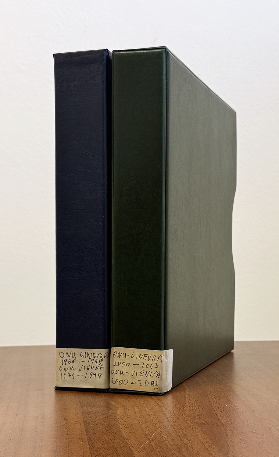ONU NAZIONI UNITE,UFFICI DI GINEVRA E VIENNA 1969/2003 - Le due collezioni complete di francobolli, foglietti e libretti nuovi del periodo, gomma integra, in due album Marini. Ottima qualità.