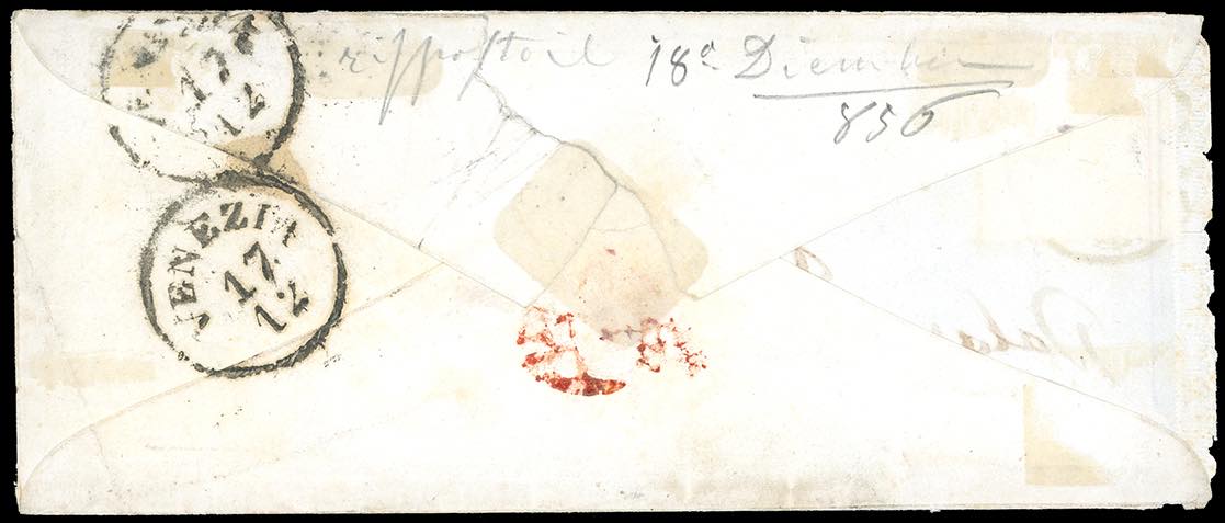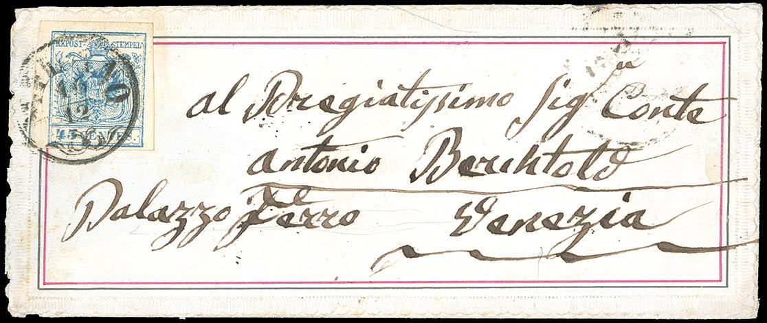 1856 - 45 cent. azzurro, III tipo, carta a macchina (22), perfetto, su bella busta valentina decorata sia ad inchiostro che a secco da Milano 16/12 a Venezia, bollo d'arrivo.