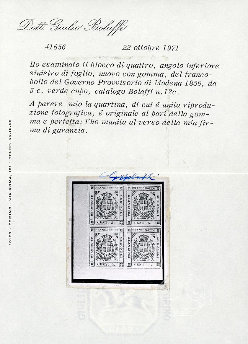 1859 - 5 cent. verde scuro (12b), blocco di quattro, angolo di foglio, nuovo, gomma originale integra, perfetto. Ottima qualità, splendido. Cert. G.Bolaffi e Cardillo.