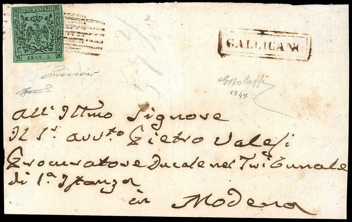 GALLICANO, 6 sbarre + cartella punti R2 - 5 cent. verde, senza punto dopo la cifra (1), perfetto, su fresco frontespizio completo di lettera per Modena. Annullo estremamente raro, pochissimi esemplari noti. G.Bolaffi, Vaccari, cert. Ferrario.