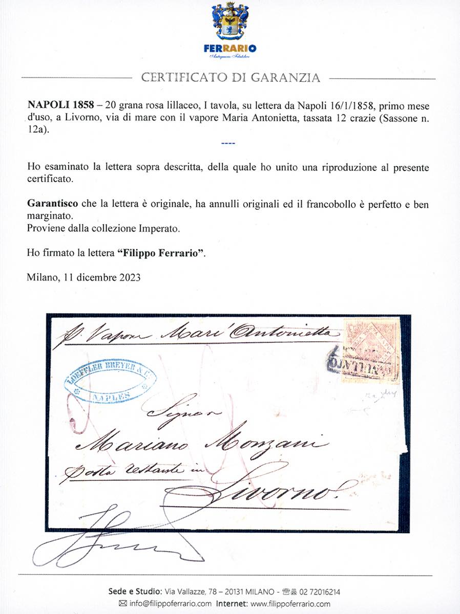 1858 - 20 grana rosa lillaceo, I tavola (12a), perfetto e ben marginato, su lettera da Napoli 16/1/1858, primo mese d'uso, a Livorno, via di mare con il vapore Maria Antonietta, tassata 12 crazie. Bella. Em.Diena, Chiavarello, cert. Ferrario. Ex coll. Imperato.
