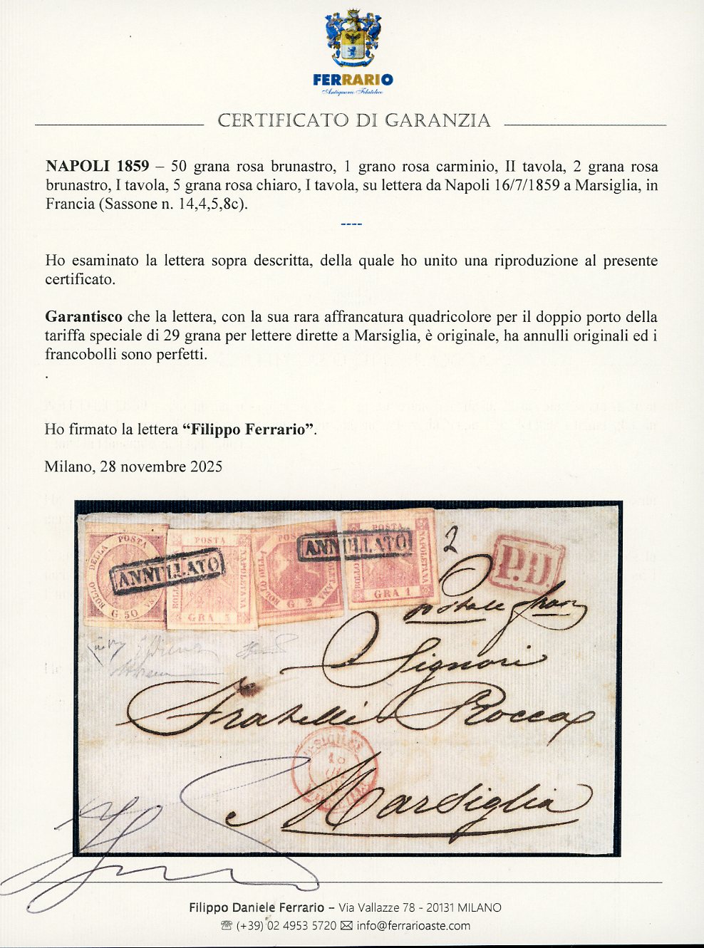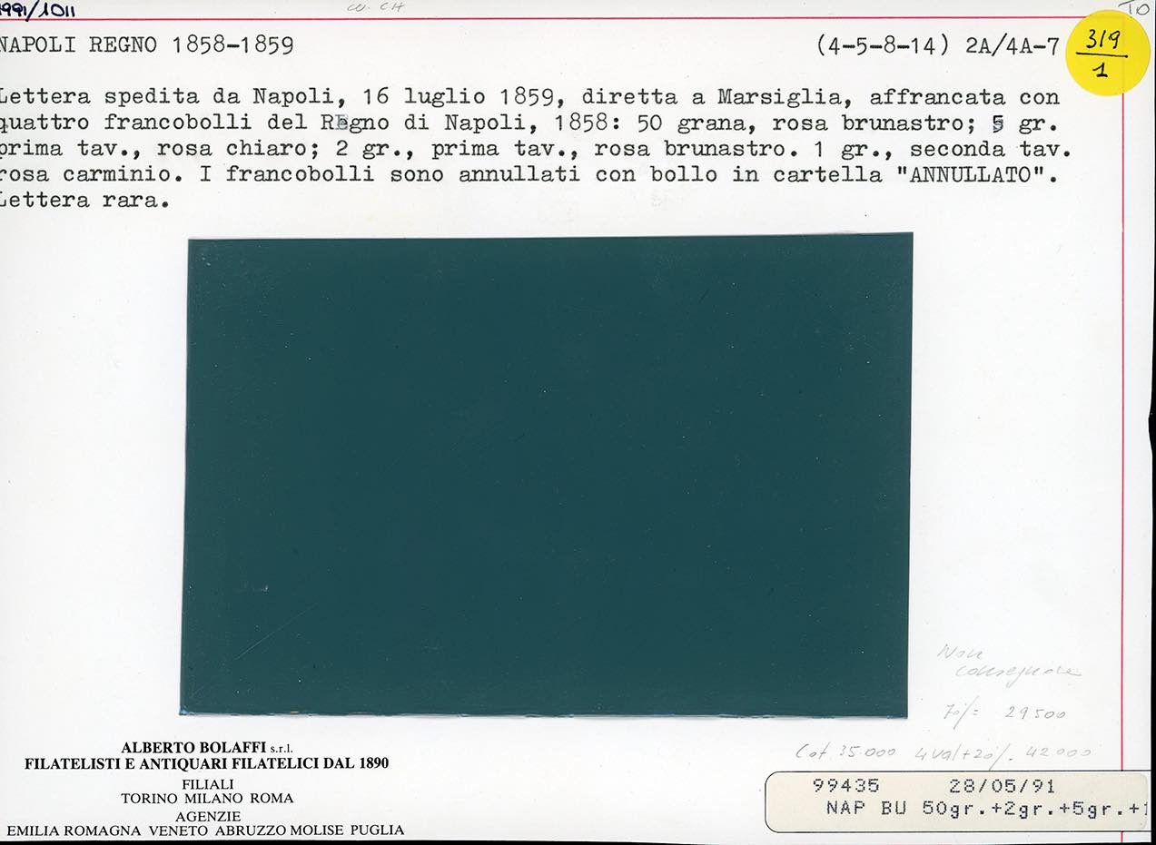 1859 - 50 grana rosa brunastro, 1 grano rosa carminio, II tavola, 2 grana rosa brunastro, I tavola, 5 grana rosa chiato, I tavola (14,4,5,8c), perfetti, su lettera da Napoli 16/7/1859 a Marsiglia, in Francia. Rara affrancatura quadricolore per il doppio porto della tariffa speciale di 29 grana, di ottima qualità. Emilio Diena, Alberto Diena, Enzo Diena e cert. Ferrario.
