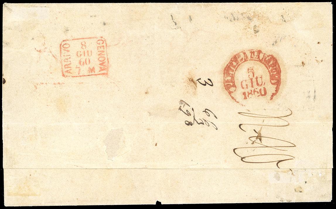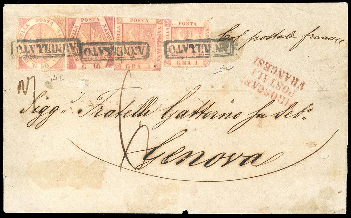 1860 - 50 grana rosa carminio chiaro, 10 grana carminio rosa, 5 grana carminio rosa e 1 grano rosa carminio (14b,11,9,4), tutti ritagliati "lilliput" lungo i margini, su lettera da Napoli 5/6/1860 a Genova, tassata 60 cent. Lineare su tre righe in rosso "Piroscafi Postali Francesi". Rarissima affrancatura "quadricolore" con tutti i francobolli lilliput. Chiavarello. Ex collezione Imperato.
