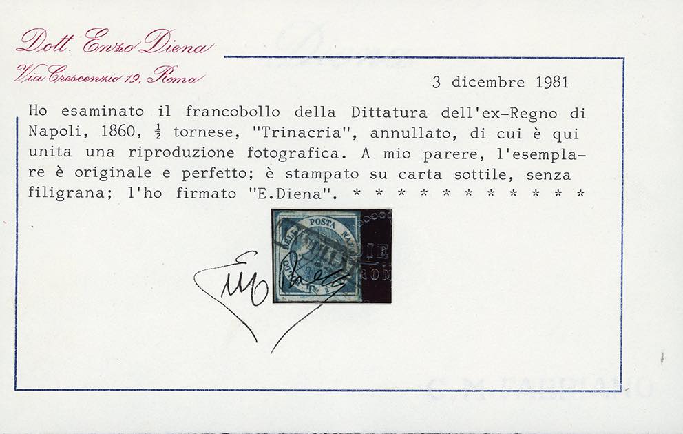 1860 - 1/2 tornese azzurro Trinacria, su carta sottile e senza filigrana (15d/g), usato, perfetto. Molto raro. Em.Diena, G.Oliva, cert. Enzo Diena e Ferrario.