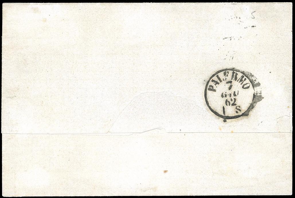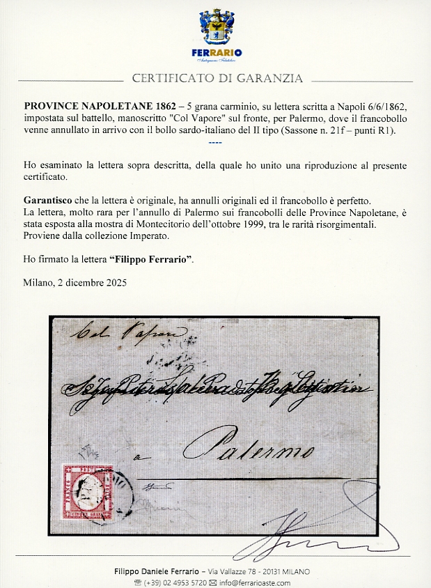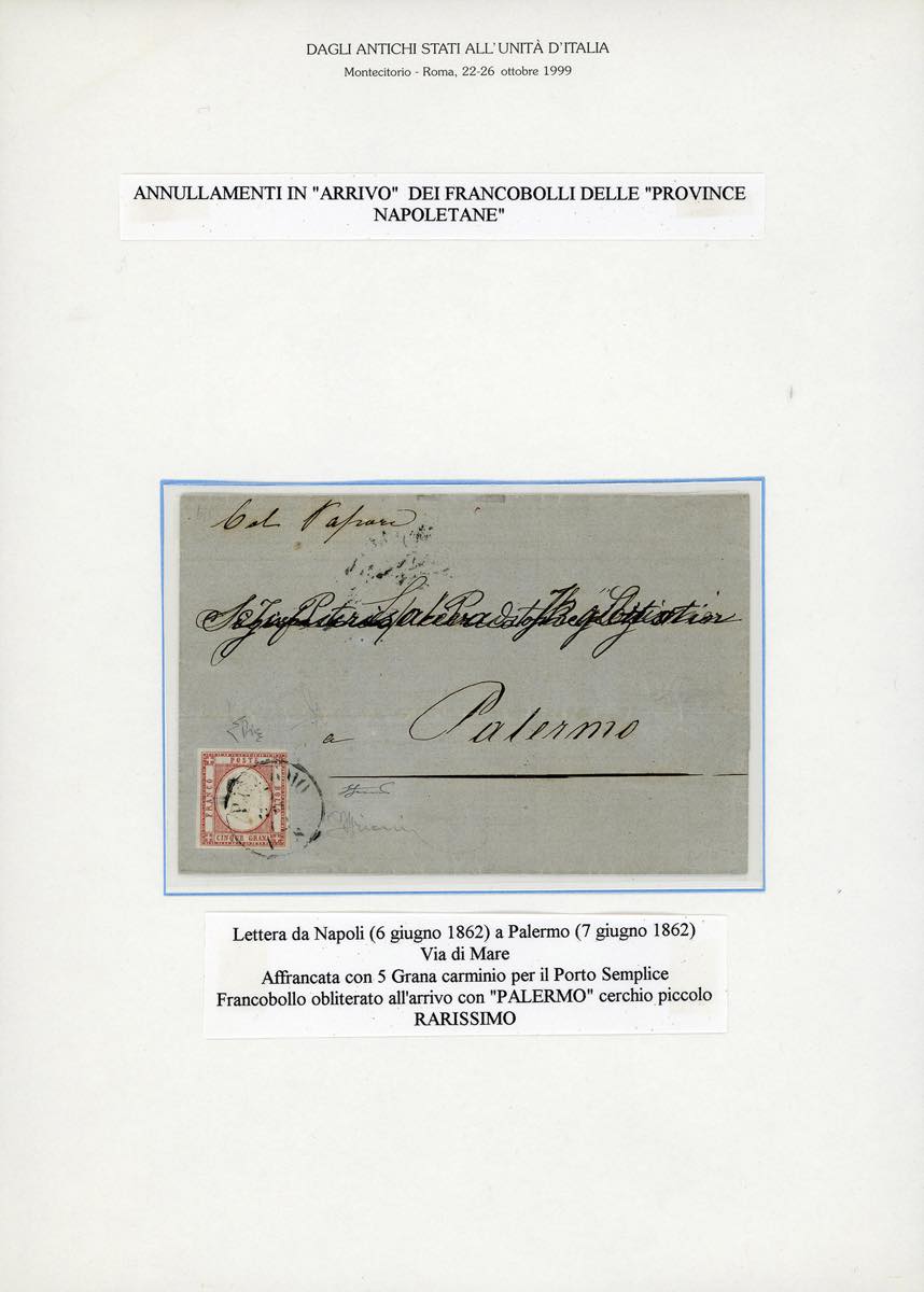 1862 - 5 grana carminio (21f), perfetto, su lettera scritta a Napoli 6/6/1862, impostata sul battello, manoscritto "Col Vapore" sul fronte, per Palermo, dove il francobollo venne annullato con il bollo sardo-italiano del II tipo (punti R1). Estremamente rara. Lettera esposta in occasione della mostra a Montecitorio del 1999 "Dagli Antichi Stati all'Unità d'Italia". Grioni, Ferrario, cert. E.Diena.