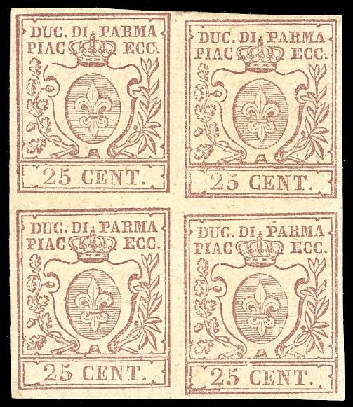 Lot 284 - 1857 - 25 cent. bruno lilla (10), blocco di quattro ...