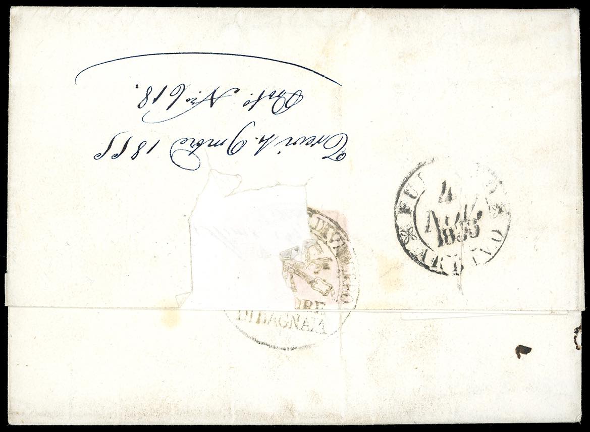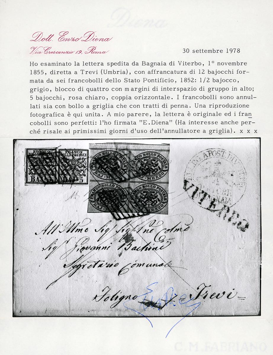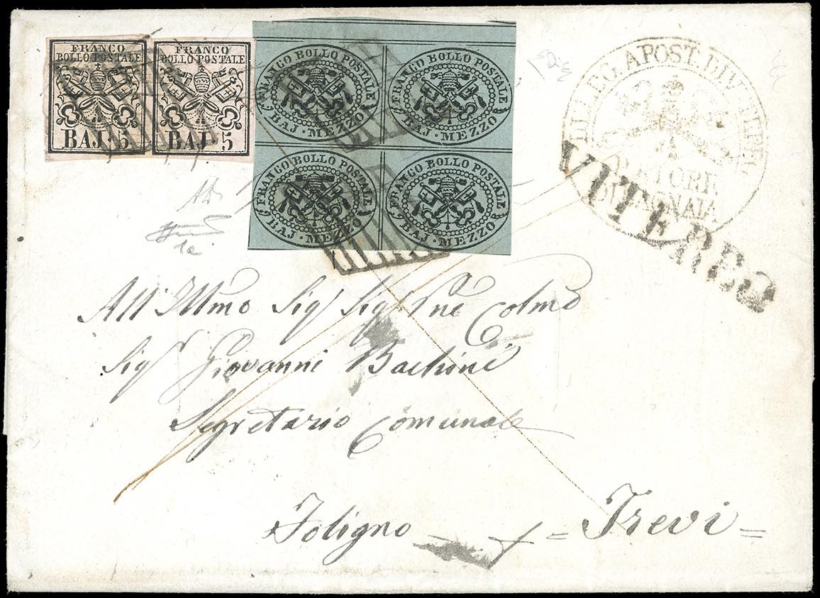 1855 - 1/2 baj grigio azzurro, tendente al verdastro, blocco di quattro con margine di interspazio di gruppo in alto, 5 baj rosa chiaro, coppia (1,6), perfetti, su fresca lettera di doppio porto da Bagnaja 1/11/1855 a Trevi, due tagli di disinfezione. I francobolli vennero annullati inizialmente con tratti di penna e successivamente con il muto a griglia di Viterbo, nei suoi primissimi giorni d'uso. Molto rara anche per la tinta intermedia del 1/2 baj. A.Diena, Ferrario, cert. E.Diena.