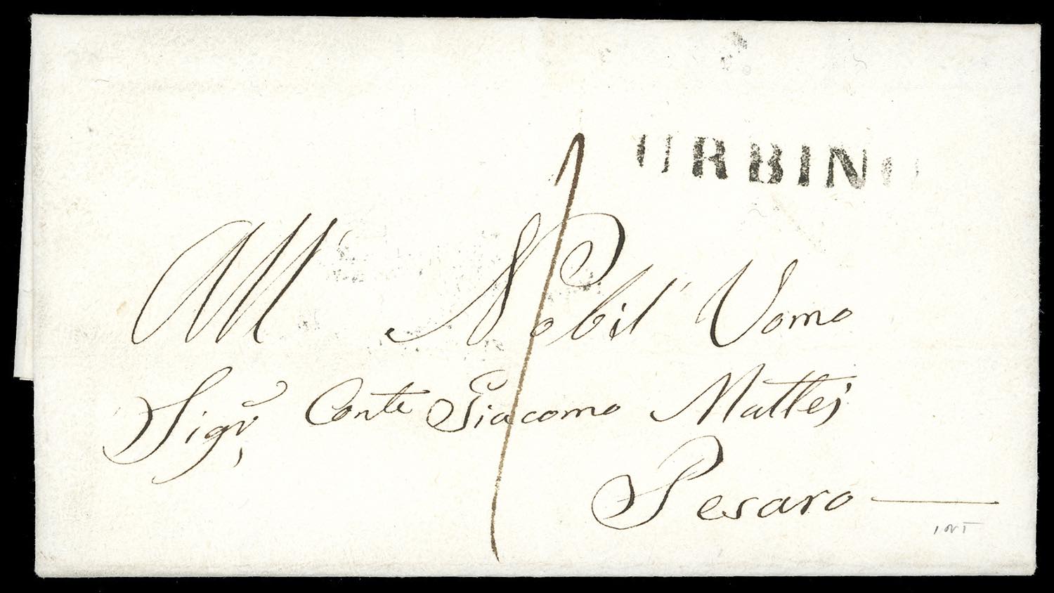 1954 - 1/2 baj grigio azzurro, stampa con inchiostro nero-oleoso (1a), coppia verticale con interspazio di gruppo al centro, perfetta, al verso di lettera in porto assegnato da Urbino 3/11/1854 a Pesaro, tassa 1 sul fronte. Interessante e non comune. A.Diena, Fiecchi, Ferrario.