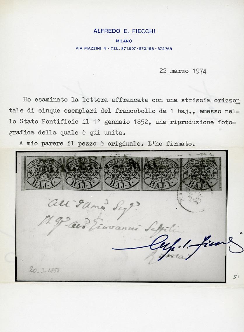 1855 - 1 baj verde grigiastro (2), striscia orizzontale di cinque, perfetta e ben marginata, su lettera da Monte S.Pietrangeli 20/3/1855 a Roma, francobolli annullati con il lineare e il datario di Macerata. Pregevole affrancatura. Cert. Fiecchi.