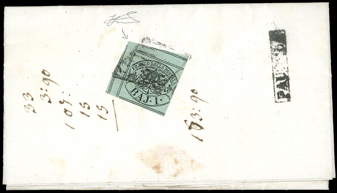 1857 - 1 baj verde grigiastro (2), esemplare mostrante l'interspazio di gruppo verticale ed orizzontale, "cuore" del foglio, leggermente intaccato a destra, al verso di lettera in porto assegnato da Pausula 22/1/1857 a Monte San Pietrangeli, tassa 1 sul fronte. Molto rara. Cert. Ferrario.
