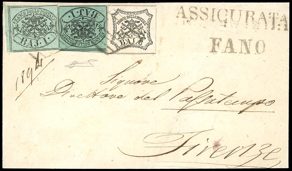 1857 - 1 baj verde grigiastro, due esemplari di colore nettamente differente, 8 baj bianco (2,9), perfetti, su lettera assicurata da Fano a Firenze, bollo di arrivo al verso del 31/10/1857. Pregevole assicurata per il Granducato di Toscana, impreziosita dall'affrancatura comprendente valori gemelli. Ferrario. Ex coll. Andreotti.