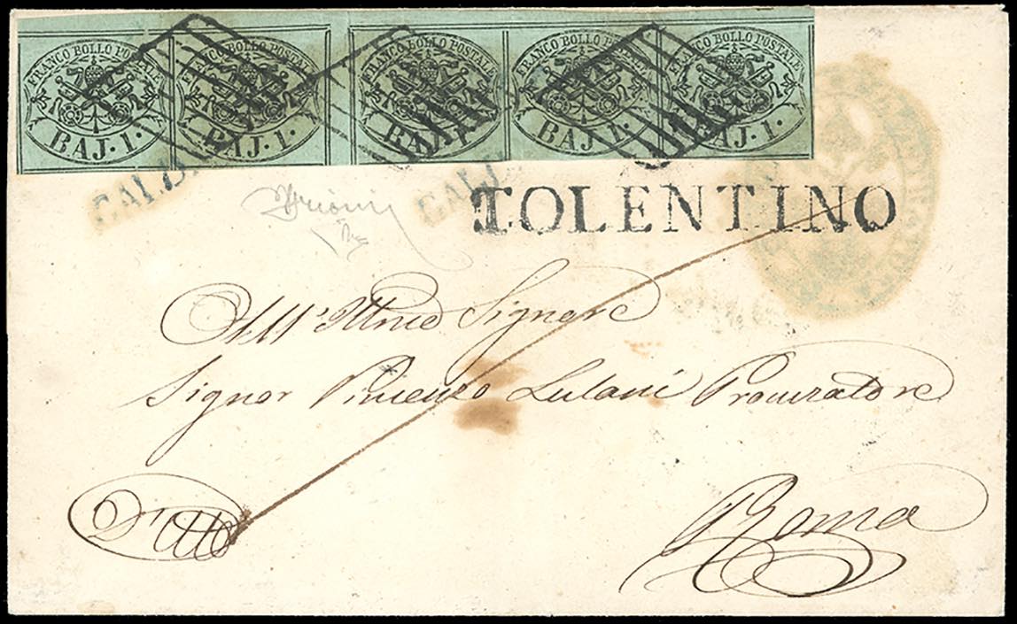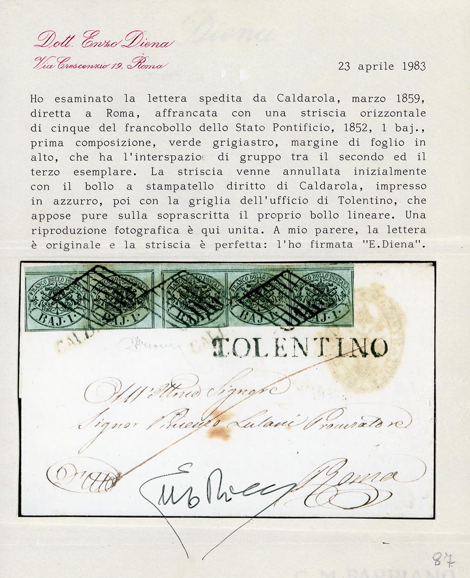 1859 - 1 baj grigiastro (2), striscia orizzontale di cinque con interspazio di gruppo tra il secondo e il terzo esemplare, piccolo bordo di foglio in alto, perfetta, su lettera da Caldarola (Sd in azzurro punti 12) a Roma 29/3/1859, lineare di Tolentino sul fronte. Bella e rara. Grioni, cert. E.Diena.