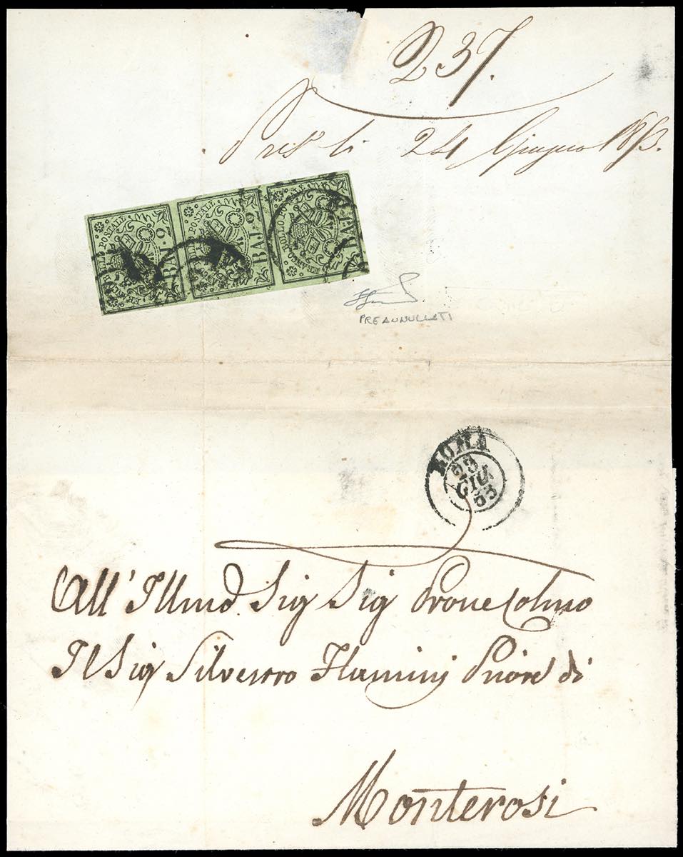 1853 - 2 baj verde oliva (3), striscia verticale di tre esemplari, preannullati con il datario di Roma, ottimo stato, al verso di lettera in porto assegnato da Roma 23/6/1853 a Monterosi. Tassazione estremamente rara con l'impiego di una striscia di preannullati, specie con annullo a datario. Insieme probabilmente unico, per specialista. Ferrario.