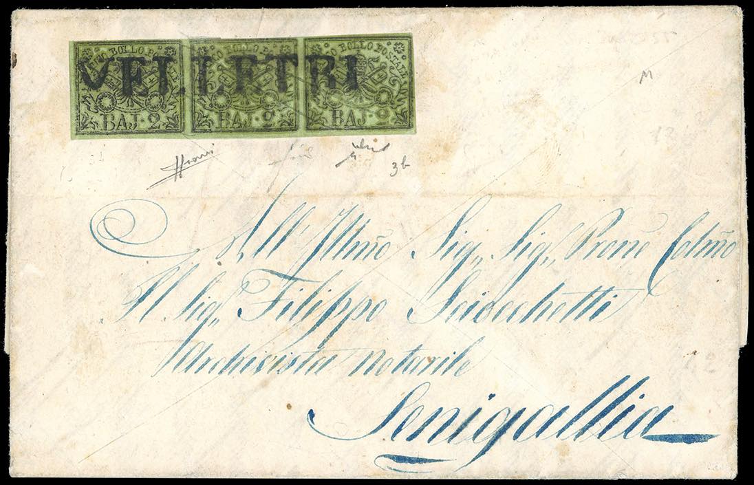 1855 - 2 baj verde giallastro, stampa con inchiostro grigio oleoso (3b), striscia orizzontale di tre, perfetto, su lettera da Velletri 30/3/1855 a Senigallia. Pregevole tariffa, impreziosita dall'impiego di questa particolare tiratura. Sorani, Fiecchi, Chiavarello.