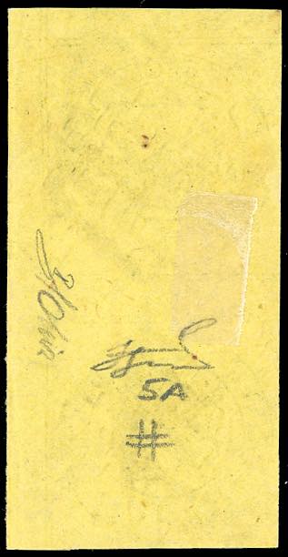 1864 - 4 baj giallo (5A), coppia orizzontale con interspazio verticale e orizzontale, mostrante il "cuore" del foglio, usata, perfetta. Rarissima. Cert. Ferrario.