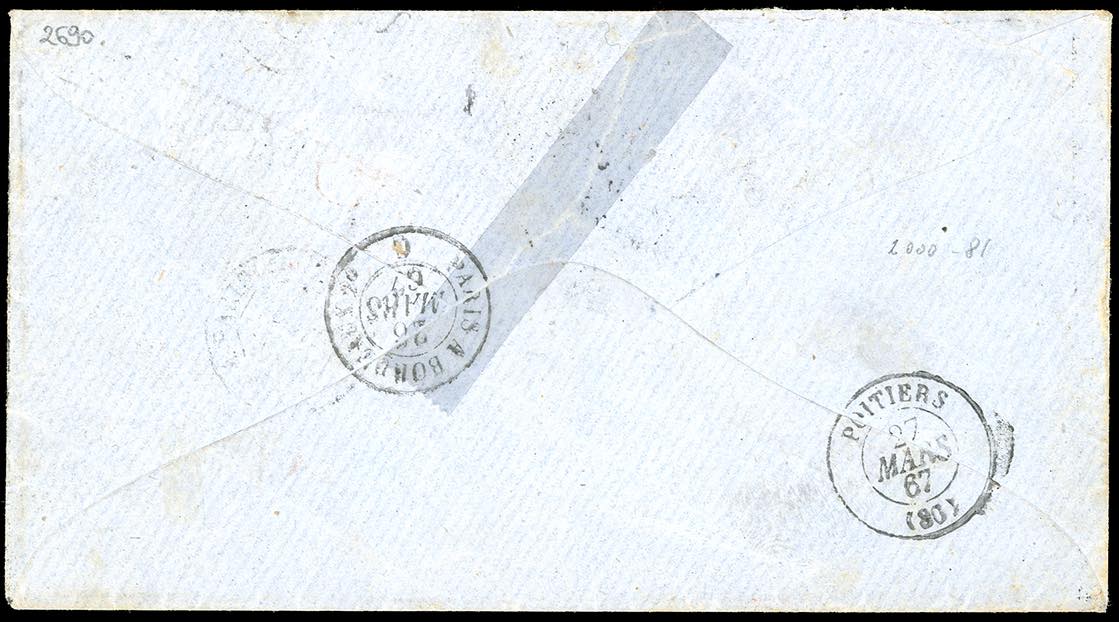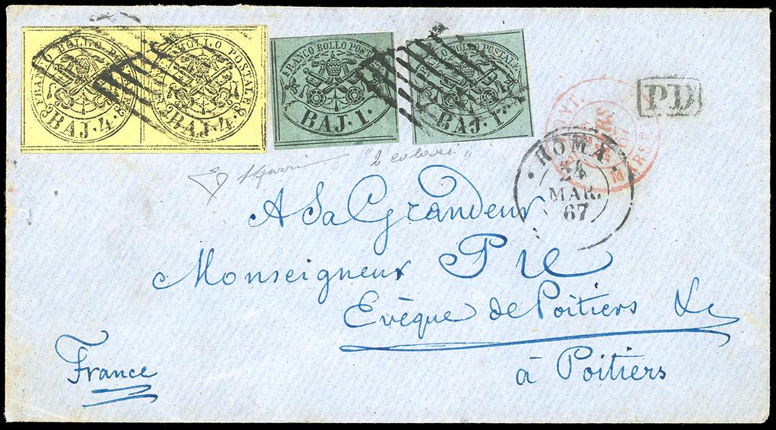 1867 - 4 baj giallo, coppia orizzontale, un esemplare otto filetti, l'altro "sette e mezzo", 1 baj verde scuro, I composizione, due esemplari di colore differente (5A,2A), perfetti, su lettera da Roma 24/3/1867 a Poiters, in Francia. Molto bella. E.Diena.