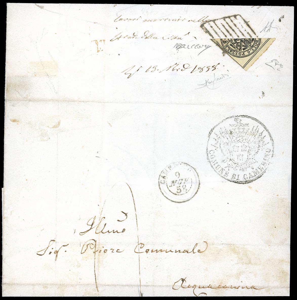 1858 - 4 baj giallo chiaro (5Ab), frazionato diagonalmente a metà, perfetto e ben marginato nei lati non interessati dal taglio, al verso di lettera in porto assegnato da Camerino 9/11/1858 ad Acquamarina, tassa 2 sul fronte. A.Diena, Raybaudi, Zuccari, cert. E.Diena.