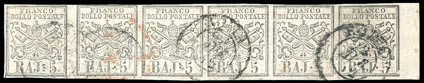 1852 - 5 baj rosa chiaro (6), striscia orizzontale di sei con interspazio di gruppo tra il primo e il secondo esemplare, bordo di foglio, usata a Roma. Rara. Ferrario, cert. A.Diena.