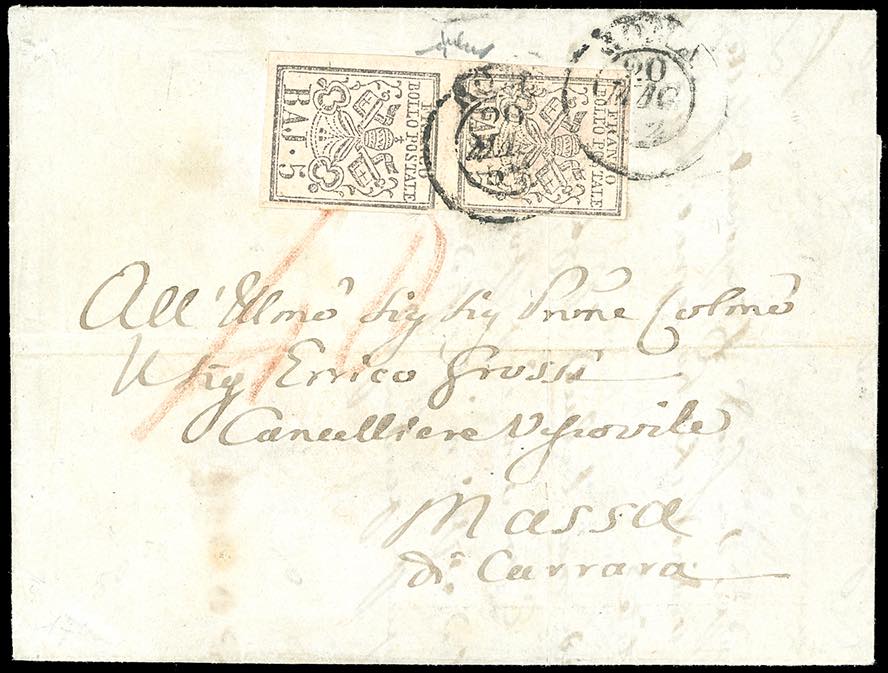 1852 - 5 baj rosa chiaro (6), coppia verticale con interspazio di gruppo al centro, ottimo stato, su lettera da Roma 20/5/1852 a Massa Carrara, tassata 40 cent. in sanguigna. Rara lettera per il Ducato di Modena precedente all'introduzione dei francobolli, possibile per soli cinque mesi. Chiavarello.
