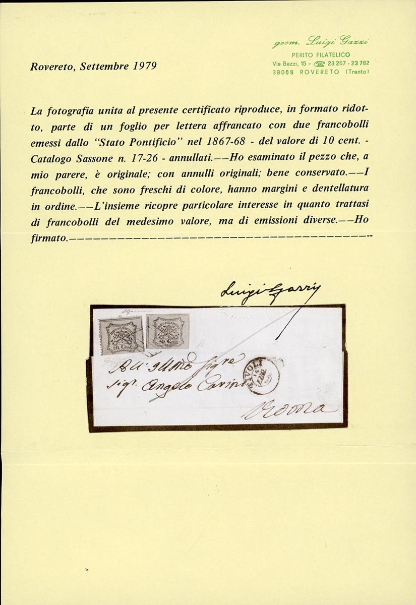 1868 - 10 cent. vermiglio arancio, non dentellato, II emissione e 10 cent. arancio vermiglio, III emissione (17,26), perfetti, su lettera da Tivoli 14/7/1868 a Roma. Eccezionale e rara affrancatura di valori gemelli di due emissioni diverse. Ferrario, cert. L.Gazzi e A.Diena. Ex coll. Imperato.