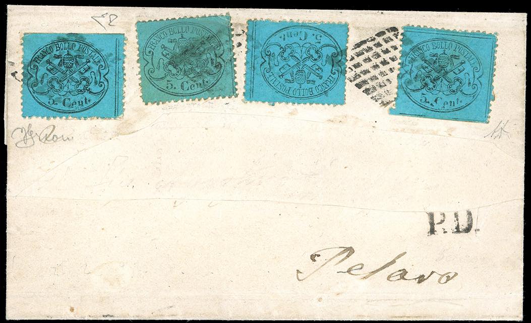 1869 - 5 cent. celeste, tre esemplari, 5 cent. azzurro verdastro (25c,25b), ottimo stato, su fresca lettera, indirizzo asportato, per Pesaro, bollo di arrivo al verso 27/2/1869. Rara combinazione di valori gemelli. Grioni, A. ed E.Diena.
