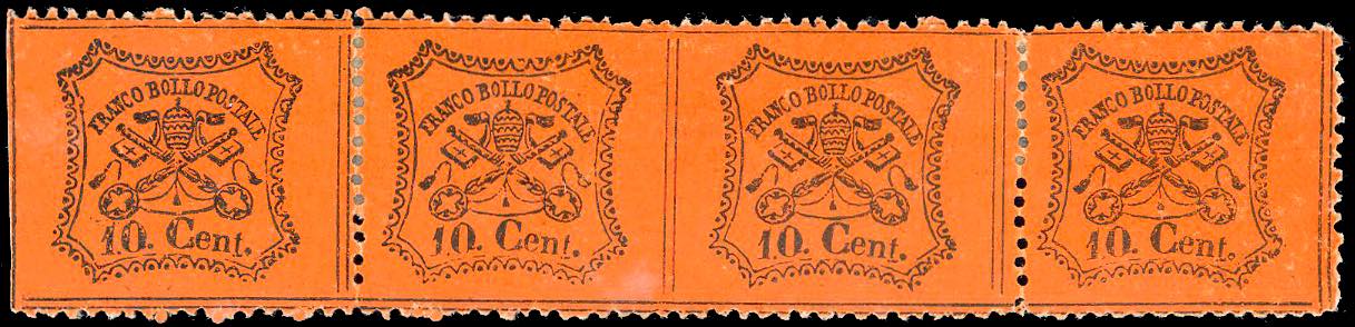 1868 - 10 cent. arancio vermiglio, carta opaca, striscia orizzontale di quattro comprendente al centro una coppia non dentellata in mezzo ... Read more