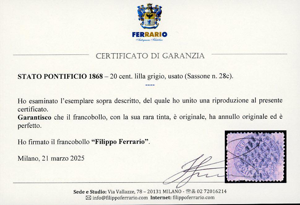 1868 - 20 cent. lilla grigio (28c), usato, perfetto. Tinta molto rara. Cert. Ferrario.