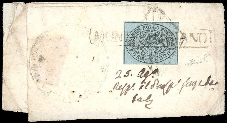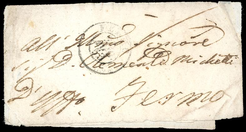 MONTERUBBIANO, Cart. + griglia bipartita di Fermo non catalogato - 1/2 baj (1a), perfetto, isolato al verso di fascetta completa di stampati per Fermo, datario di arrivo sul fronte del 25/8/1853. Combinazione di coannullatori inedita. Cert. Ferrario.