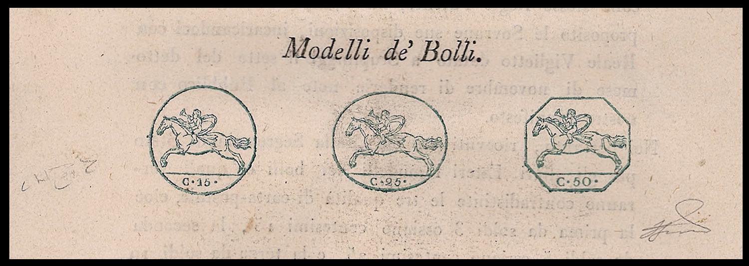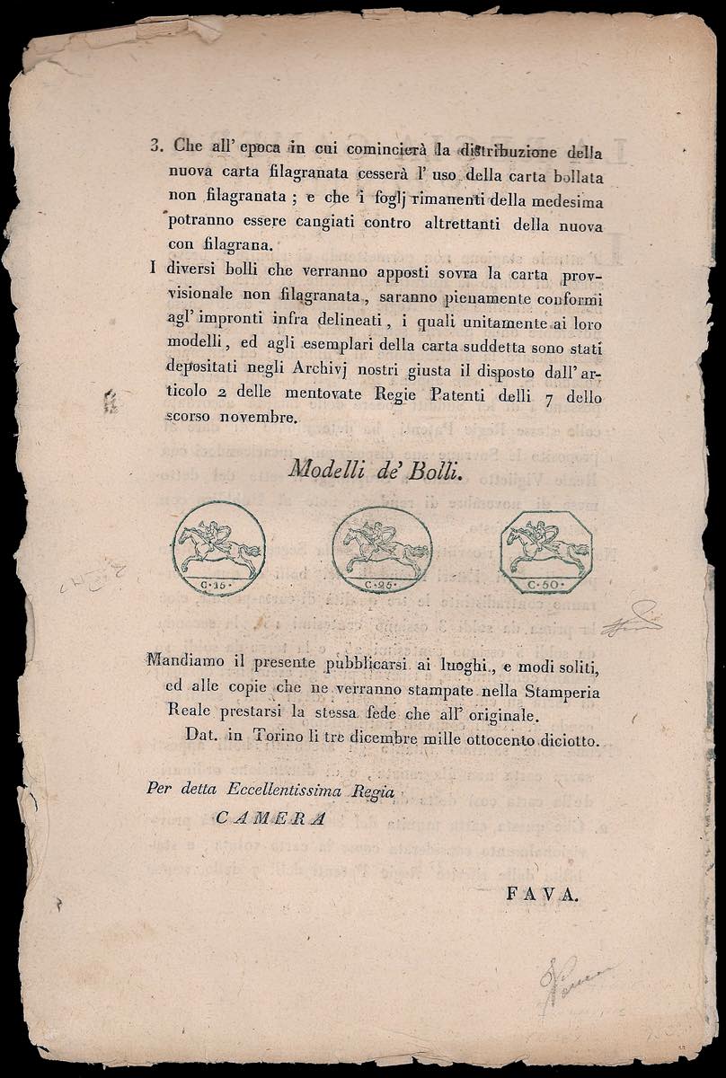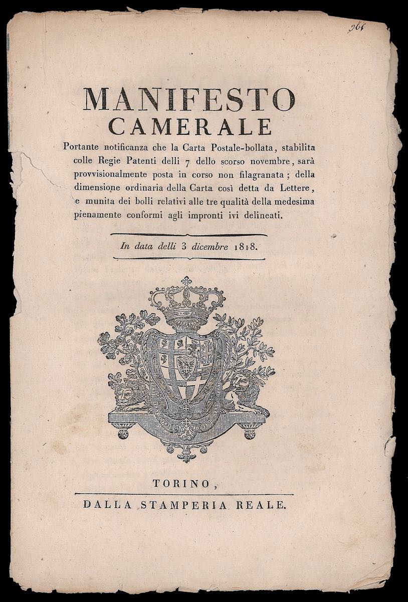 1818 - Manifesto camerale del 3/12/1818 in lingua italiana, con le impronte dei tre Cavallini a stampa. Raybaudi, Ferrario.