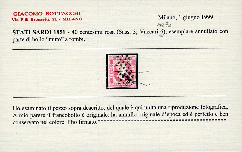 1851 - 40 cent. rosa (3), usato, perfetto. Molto fresco e di ottima qualità. Cert. Bottacchi e Vaccari.