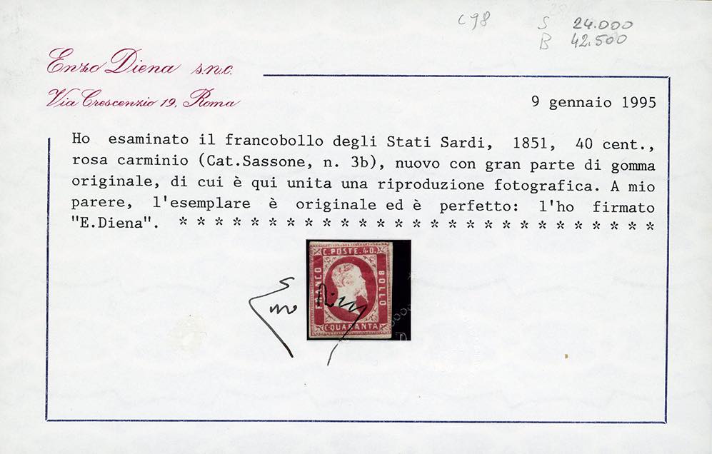1851 - 40 cent. rosa carminio vivo (3b), nuovo, gomma originale, colore molto intenso, due piccoli difetti in alto. Raro. Cert. E.Diena ... Read more